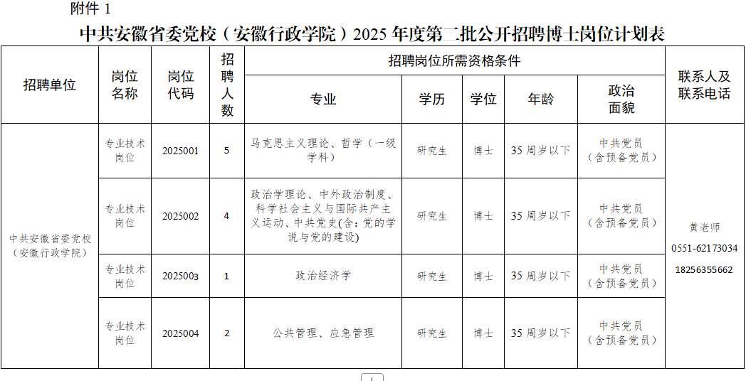 附件:1中共安徽省委黨校(安徽行政學(xué)院)2025年度第二批公開(kāi)招聘博士崗位計(jì)劃表